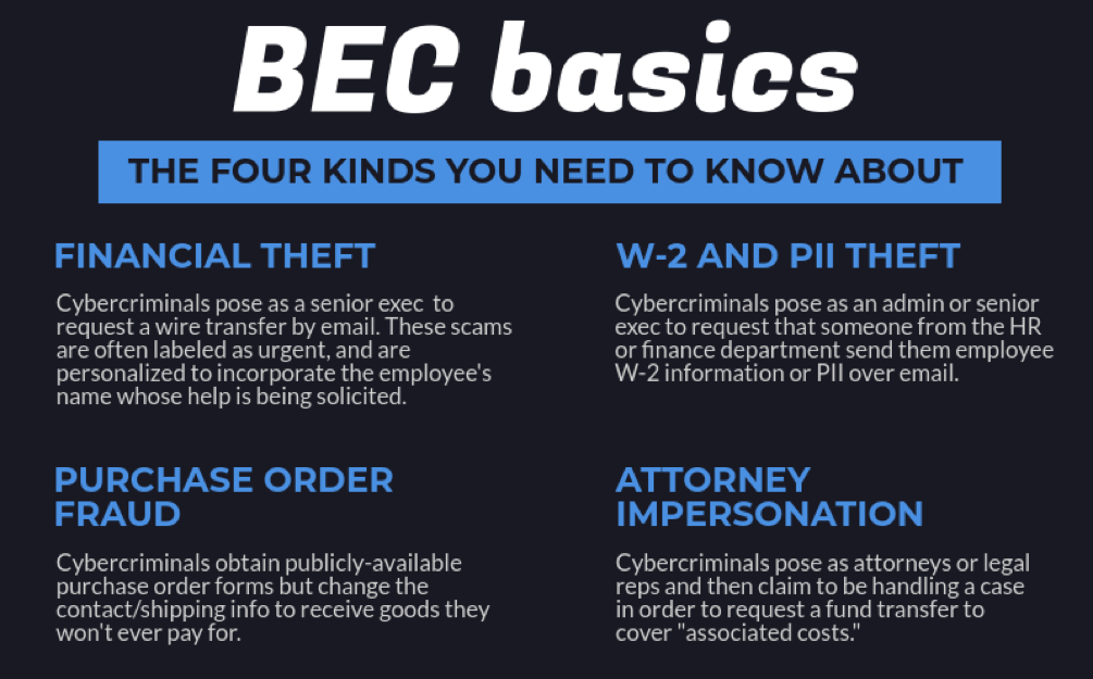 BEC cons, also referred to as man-in-the email attacks, are sophisticated email- and electronic communication based-scams through which attackers gain access to or impersonate a business executive, employee, or other person to defraud the company, customers or partners. Attacks are often used to solicit payments or retrieve funds, such as bogus invoicing scams or those geared toward gaining access to employee payroll and W2 information. Since October 2013, the Federal Bureau of Investigation has identified victims from 131 countries and a global monetary exposure of more than $5 billion related to BEC fraud.