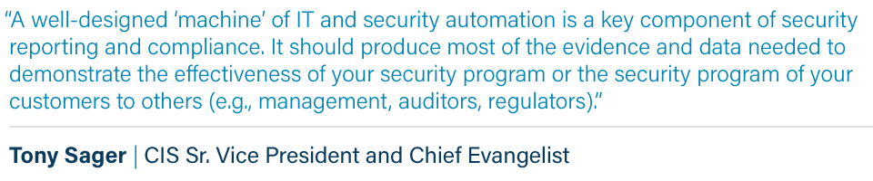 As we discussed in the previous section, CIS Benchmarks (either directly or through cloud images) are a tremendous starting point — industry-accepted with demonstrable security value. But they must also be actively managed, which establishes the need for a designed program of automation, reporting, and correction. That's why automation, based on standards, has been a theme of the CIS Controls since their inception. A well-designed “machine” of IT and security automation is a key component of security reporting and compliance. It should produce most of the evidence and data needed to demonstrate the effectiveness of your security program or the security program of your customers to others (e.g., management, auditors, regulators).