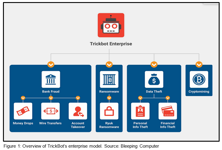 TrickBot is a distant descendant of the ZeuS banking Trojan that emerged in 2005, but is most often traced back to Dyre or Dyreza, which went offline in 2015. TrickBot emerged in 2016, reusing aspects of Dyre’s code and retaining its banking credential harvesting capabilities and web inject infrastructure. TrickBot is now a malware empire with numerous plugin modules, cryptomining and persistence capabilities, and a growing association with follow-on ransomware infections. Beginning in June 2019, the MS-ISAC observed an increasingly close relationship between initial TrickBot infections and eventual Ryuk ransomware attacks. TrickBot also caught the attention of government and private entities in fall 2020, when it was reported that U.S. Cyber Command and private sector partners acted to blunt TrickBot’s reach and reduce chances its operators could interfere with 2020 U.S. election infrastructure. [1]