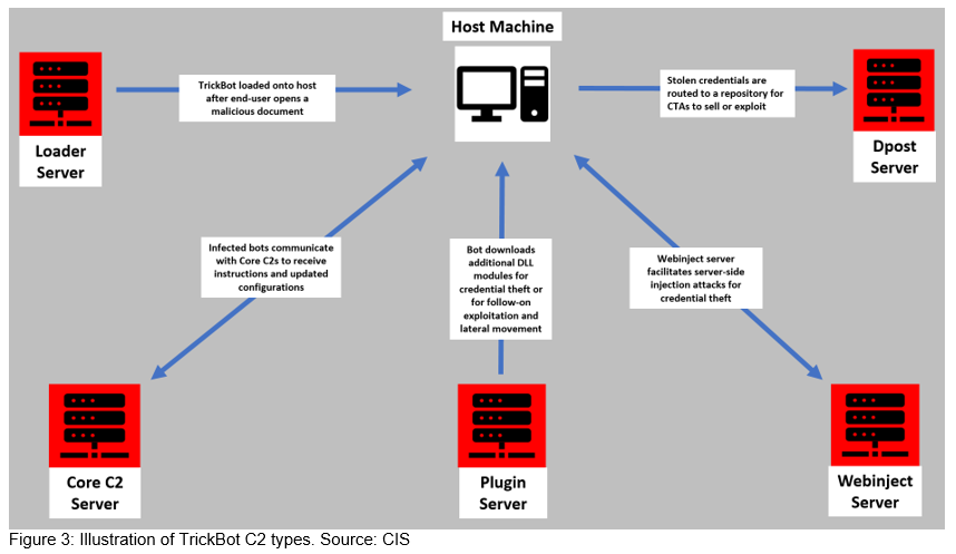 TrickBot boasts resilient command and control (C2) infrastructure and a follow-on exploitation framework. It uses several types of infrastructure to support its array of functions and to withstand government and private sector takedown attempts. The CTAs operating TrickBot are constantly varying and replacing C2 infrastructure, making tracking and takedowns very difficult. TrickBot’s server types and functions include: