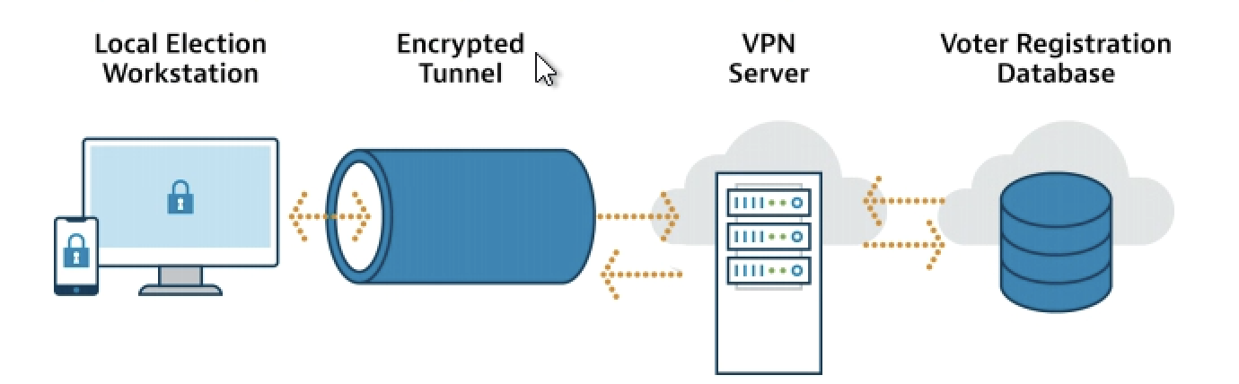 When an employee connects to a VPN, it will appear as if they are connecting to the internet from the organization’s network, instead of their remote location. Below is a diagram showing how VPNs may be used in an election system.